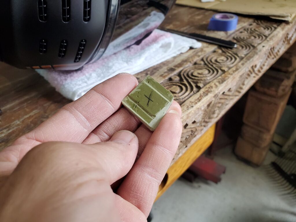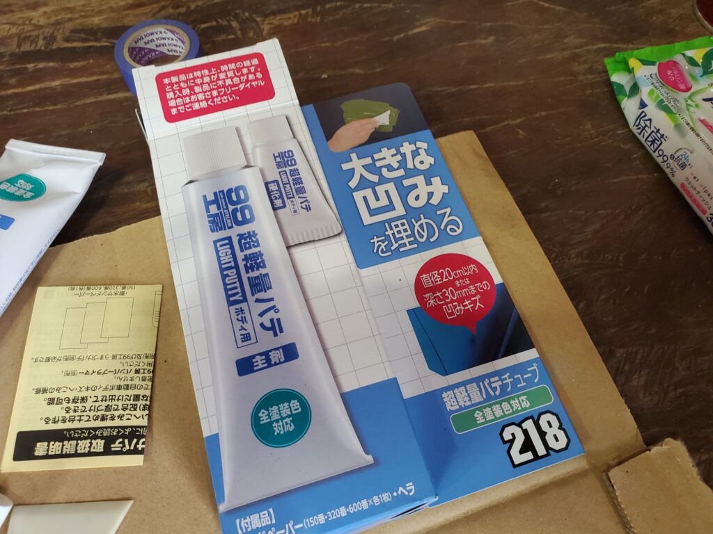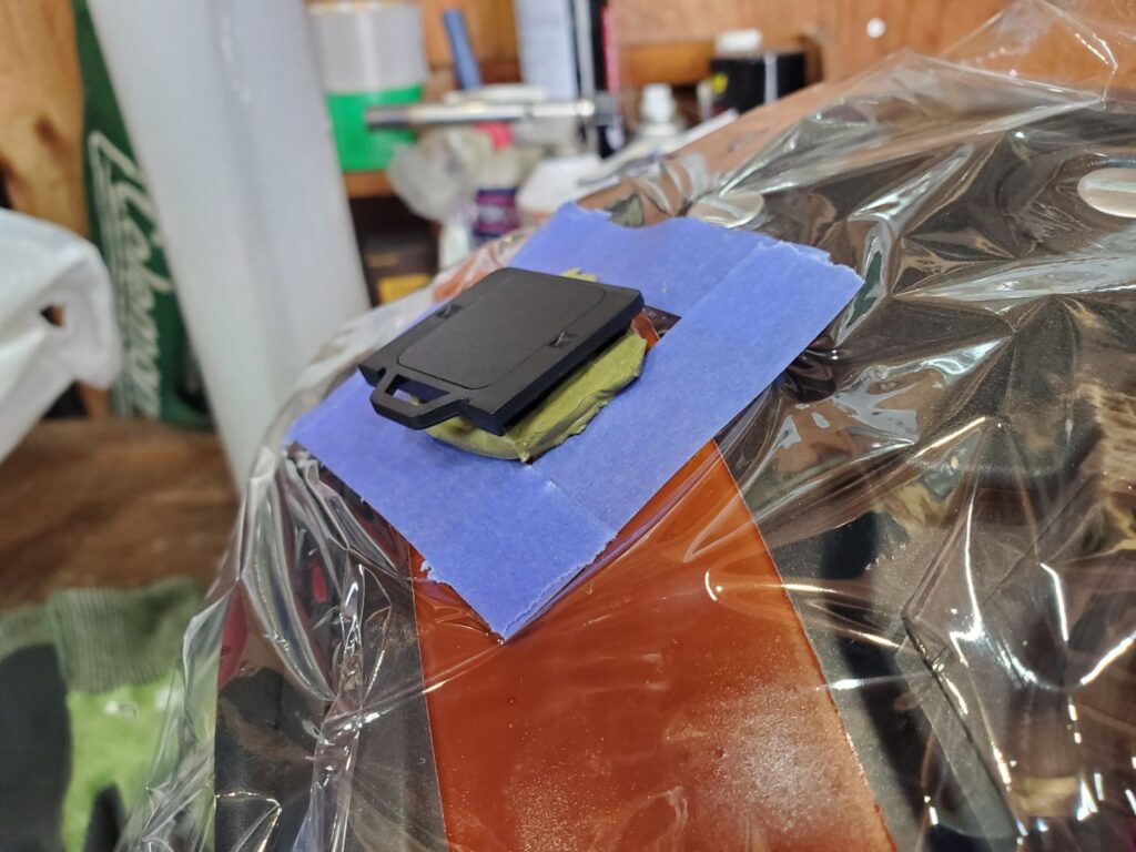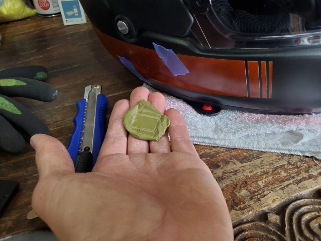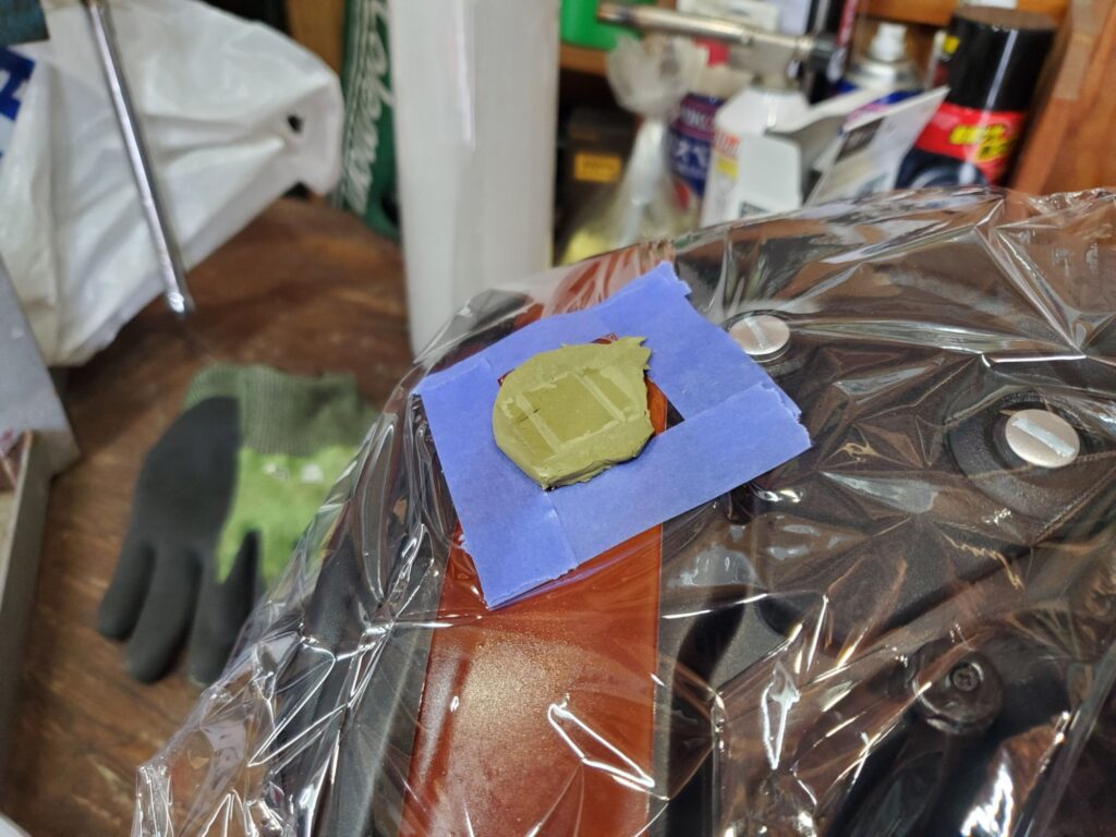 ここで注意ですが、ラップ一枚敷いたくらいでは パテが固まる過程でヘルメット側が変色します!