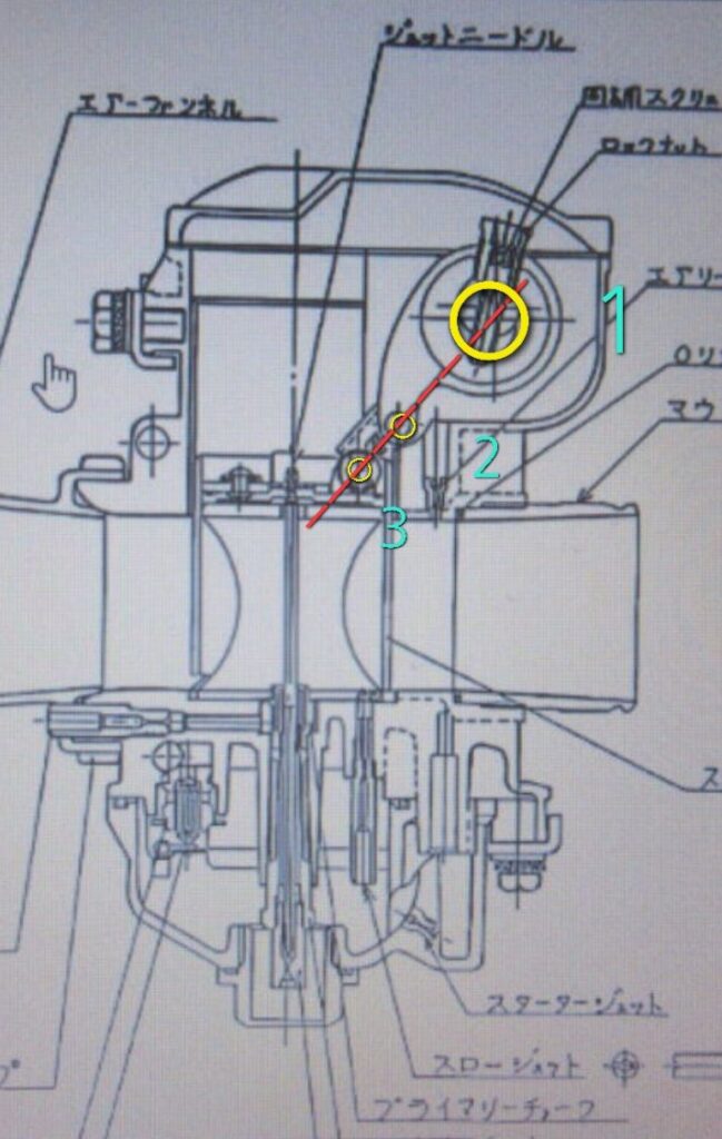 アイドリングを調整するときは、これ以上軸②を下げないように気を付けながら・・・
